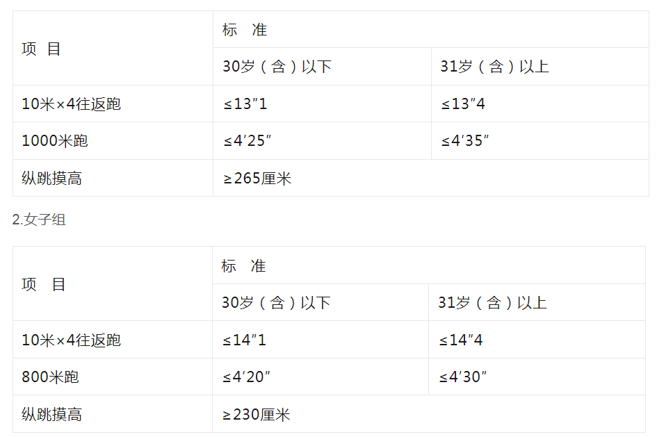 体能考核的标准,参照《关于印发公安机关录用人民警察体能考核项目和标准(暂行)的通知》(人社部发〔2011〕48号)的标准,具体如下:(见附表)